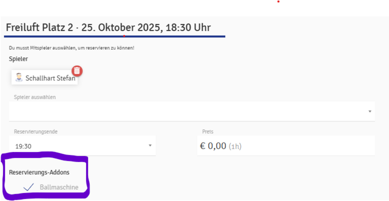 Reservierung im System - einfach Hacken bei der Ballmaschine setzen!